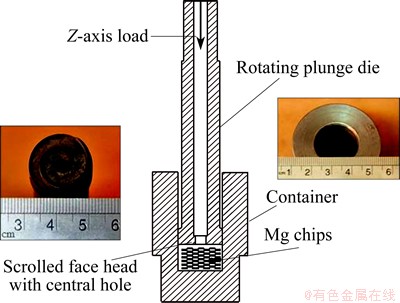 The clean and dry Mg chips used in this work was produced through machining Mg ingot without any lubricant fluid. The machining chip was prepared by a planning machine. The chip was 6-10 mm in length, 1-4 mm in width and about 0.2 mm in thickness. The chemical composition of the pure Mg ingot is <0.01% Al, 0.006% Cu, 0.03% Mn, 0.005% Zn, 0.005% Ca, <0.002% Sn and balanced Mg (mass fraction). The main components used in the process including a container and a rotating plunge die with scrolled face, which were made of H13 tool steel. The container cavity is 21 mm in diameter and 50 mm in height. The rotating plunge die has a 20 mm outer diameter with a 5 mm central hole which defines the diameter of the extruded wire. As shown in Fig. 1, the rotating plunge die has a scrolled face pattern with zero tilt angle. The scrolled face pattern is similar to the FSW tool shoulder design [17]. The container was fixed on the table of computer numerical control (CNC) milling machine. The rotating plunge die rotates in a clockwise direction and moves toward the container which is charged with Mg chips. The rotation and movement of the plunge die relative to the container cause the mixing and stirring of Mg chips, during which the contact and pressure between the rotating plunge die and Mg chips lead to the conversion of mechanical energy to thermal energy. The wire length is limited by the volume of the container. The extrusion axis is Z-axis of the machine, therefore, the extrusion force is equal to Z-force. Three rotational speeds of 180, 250 and 355 r/min under constant plunge rate of 120 mm/min were implemented. An infrared thermometer was used to monitor the temperature changes during the process. The temperature measurement is needed for the thermal analysis of the process. The schematic representation of the FSE process is shown in Fig. 2.
