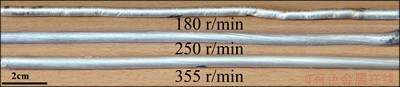 The surface appearances of the wires produced by the FSE process are shown in Fig. 4. Good and poor surface quality of wires are observed. The most important parameter affecting the process is the rotational speed [18]. Low rotational speed leads to insufficient heat generation during the process which increases the possibility of the extrusion defects. As shown in Fig. 4, there are twisting and cold tearing along with the wire surface at the rotational speed of 180 r/min. However, at the rotational speeds of 250 and 355 r/min, the entire lengths of the wires are with smooth surface and without any cracks. Moreover, the results show that the surface roughness is minimum at the rotational speed of 355 r/min, with the Ra values in the extrusion and traverse directions are 0.23 and 1.41 μm, respectively.
