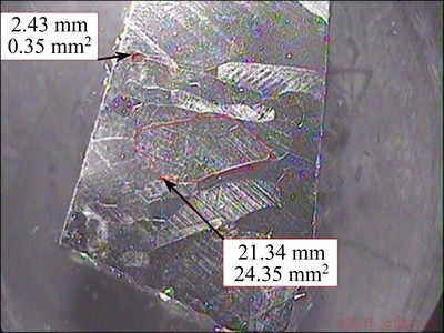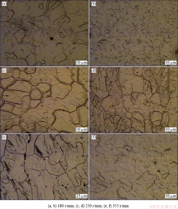 The optical image of the parent material is shown in Fig. 5. It is apparent that large grains are distributed in the parent material with the size of several millimeters, whereas the extruded specimens show relatively fine grains. The comparison of the microstructure views between the parent material and the wires in Figs. 5 and 6 proves that the grain refinement happens during the FSE process. In the FSE process, dynamic recrystallization that occurs during the deformation leads to the generation of fine grains. However, the average grain size is probably affected by the heat amount factor which is the direct result of the die rotation speed. The average grain size in the center of each specimen is shown in Table 1, which was measured by the mean linear intercept method. The average grain size in the FSE specimen ranges from 9 μm to 27 μm, which is much smaller than that of the base material (BM). Moreover, the two optical microscopy images for each sample show that the microstructure is not uniform along the wire. As shown in Fig. 6, in all specimens, the grains in the center are larger than those in the boundary of the wires. This may be attributed to the higher strain rate in the center regions.