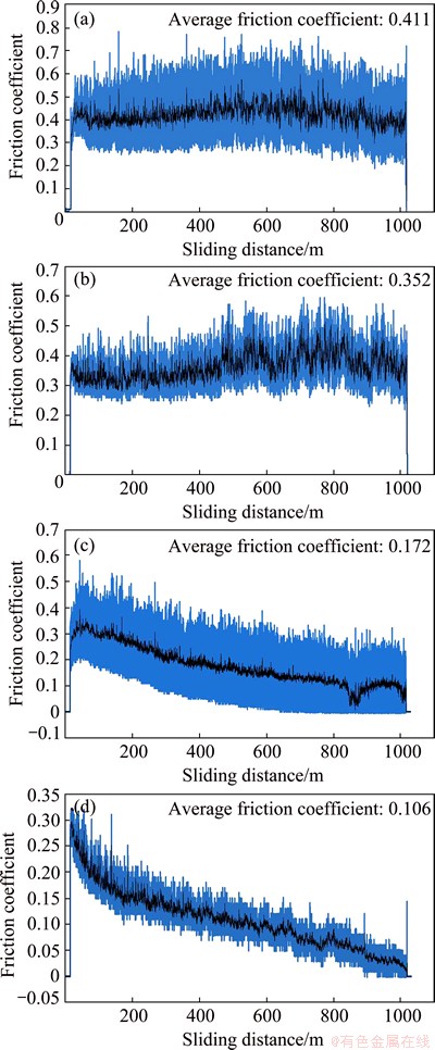 Fig. 8 Variation of friction coefficient of BM (a) and wires produced at rotational speed of 180 r/min (b), 250 r/min (c) and 355 r/min (d)