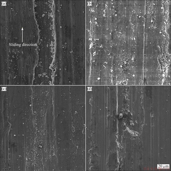 Fig. 9 Typical worn surface morphologies of BM (a) and wires produced at rotational speed of 180 r/min (b), 250 r/min (c) and 355 r/min (d)