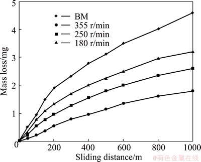 Figure 8 shows the variation of friction coefficient with sliding distance (SD) for the BM and the FSE samples. The average friction coefficient of the BM is found to be 0.411 as indicated by high fluctuations in the friction curves. The minimum value of friction coefficient is about 0.106 that is achieved at the rotational speed of 355 r/min, which is clearly much lower than that of the BM. From Fig. 8, it is found that the average friction coefficient of 180 r/min sample is significantly higher than those of 250 and 355 r/min samples. This result was not unexpected due to the lower hardness values of 180 r/min sample shown in Fig. 7.