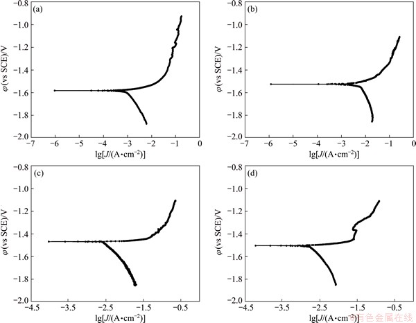 Fig. 11 Potentiodynamic polarization curves of BM (a) and wires produced at rotational speed of 180 r/min (b), 250 r/min (c) and 355 r/min (d)