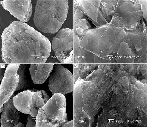 In addition, scanning electron micrographs(SEM) of the untreated natural graphite and modified graphite are shown in Fig.2. These four micrographs show that top- surface morphology of the graphite is retained, and the size and shape of the graphite are not changed. The surface of natural graphite is smooth. However, the modified graphite presents many white stripes clearly, and some white floccules can be seen on the surface of the treated graphite from Fig.2(c).