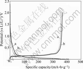 Fig.4 Charge-discharge curves of graphite (a) and modified graphite (b) electrodes in 1 mol/L LiPF6/EC/DMC electrolyte for first cycle at 0.1 mA/cm2