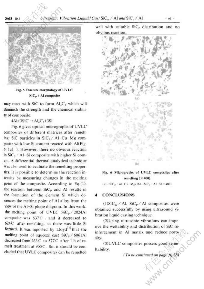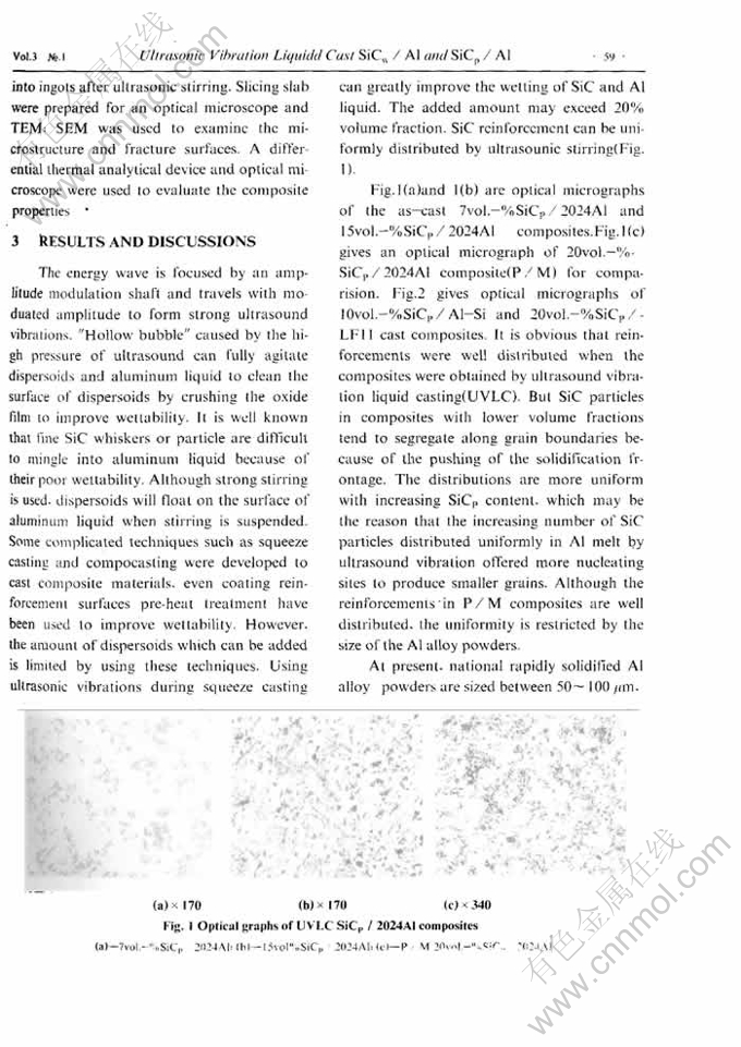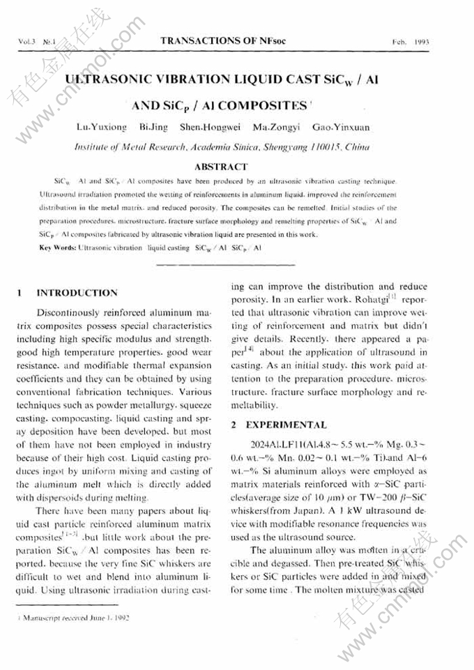 Key words:Ultrasonic vibration; liquid casting; SiCw/Al; SiCp/Al