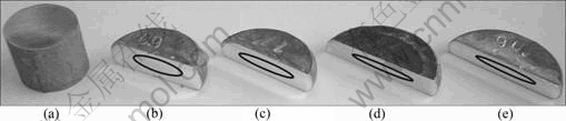 Fig.1 Appearance of specimens subjected to different compression ratios: (a) As-cast; (b) 30%; (c) 45%; (d) 60%; (e) 70%