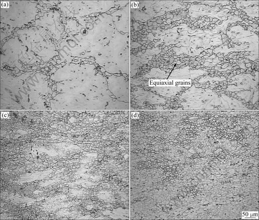 Fig.2 Typical microstructures of central zone of specimens subjected to compression at different ratios: (a) 30%; (b) 45%; (c) 60%; (d) 70%
