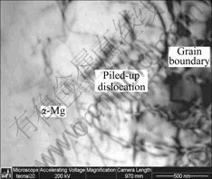 As shown in Fig.5, dislocations in different planes cross slip in α-Mg matrix and pile up in the region next to grain boundary to form dislocation networks. As a result of the orientation preference of their generation and high mobility, the density of the dislocations in central region and in the unfavorable slipping directions remains low, leading to an inhomogeneous distribution in the grains[8].