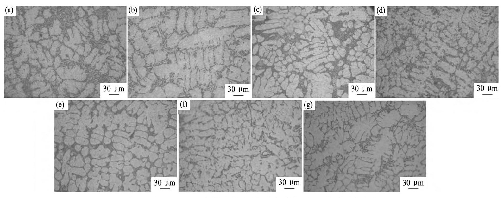 图3 Al-5Ti-1B-4Sr中间合金变质不同时间Al-8Si合金金相组织Fig.3 Microstructure of Al-8Si alloy modified by Al-5Ti-1B-4Sr master alloy with different time (a) 0 min; (b) 10 min; (c) 20 min; (d) 30 min; (e) 40 min; (f) 60 min; (g) 80 min