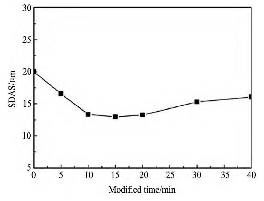 图4 Al-8Si合金变质时间与二次枝晶臂间距关系曲线Fig.4 Effect of modified time on SDAS in Al-8Si alloy