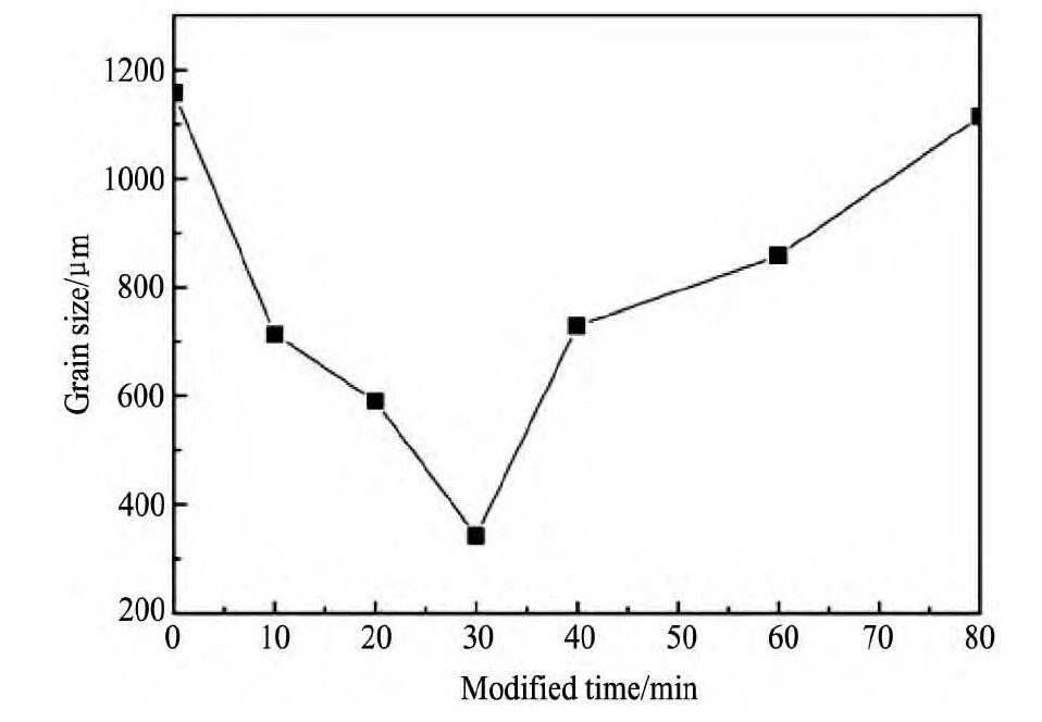 图7 Al-8Si合金变质时间与共晶团尺寸关系曲线Fig.7Effect of modified time on eutectic cell size of Al-8Si alloy