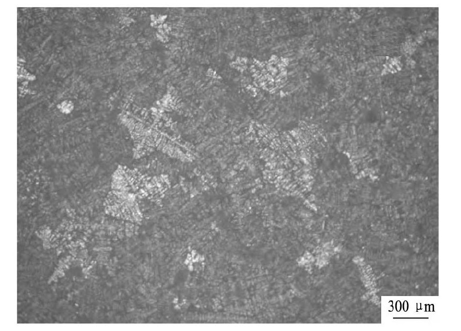 Al-5Ti-1B-4Sr中间合金不同时间细化变质时间的Al-8Si合金宏观组织如图5所示。从图5中可以看出, 随着细化变质时间的增加, Al-8Si合金的宏观晶粒尺寸 (可看作共晶团尺寸) 先减小然后稍微增加, 细化变质时间为30 min时宏观晶粒尺寸最小。典型宏观组织试样放大50倍的金相组织如图6所示。从图6中可以明显看出每个宏观晶粒为一个共晶团。
