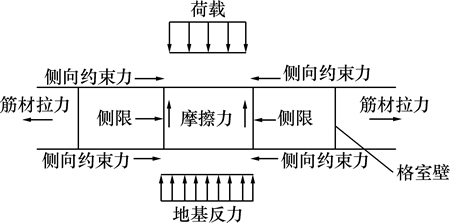 土工格室对级配碎石的侧向限制作用主要表现为土工格室与填料产生的摩阻效应与土工格室对格室内的碎石的紧箍作用。其作用机理如图2所示。