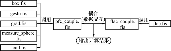 在运行程序时,只运行耦合程序pfc_couple.fis文件与生成下承层土基的flac_couple.fis文件,通过调用其他文件及保存计算状态的sav文件,通过耦合计算,进行数值模拟分析,其流程图如图3所示。