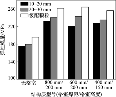 从图6可以看出:在采用同样型号的3种土工格室加固碎石材料中(800 mm/200 mm,600 mm/200 mm,400 mm/150 mm),级配颗粒结构的弹性模量最大,比粒径为20~30 mm的碎石的弹性模量分别高出20,22和26 MPa;比粒径为10~20 mm的碎石的弹性模量分别高出29,44和30 MPa。这是由于采用PFC3D对碎石集料进行模拟时,颗粒的接触面比碎石集料的真实的接触面小,级配颗粒由于其颗粒粒径分布均匀,颗粒在加载过程中其压实度较高,相应的颗粒间的接触状况也较好,因此,当级配颗粒作为填料使用时,其土工格室结构层具有良好的承载能力。同时粒径为20~30 mm的碎石作为填料时,其结构层的弹性模量要高于填料为粒径为10~20 mm的碎石的土工格室结构层的弹性模量,最小差值为4 MPa,最大为22 MPa。粗颗粒间的摩擦力、嵌锁作用为级配碎石强度的主要来源,随着颗粒粒径的增大,级配碎石结构层的承载能力也相应地提高。