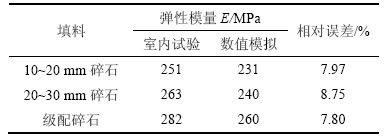 通过计算得出各结构层的弹性模量,选取土工格室型号为800 mm/200 mm时,粒径为10~20 mm和20~30 mm的2档碎石以及带有级配的碎石颗粒的弹性模量进行室内与数值模拟对比分析,结果如表3所示。