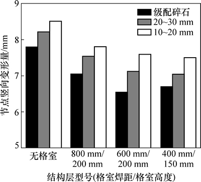2) 随颗粒粒径的增大,碎石结构层的承载能力提高,当粒径为20~30 mm的碎石作为填料时,其结构层承载能力大于粒径为10~20 mm的碎石作为填料时土工格室结构层的承载能力,弹性模量前者比后者高4~22 MPa,下承层节点竖向位移前者比后者低0.3~ 0.5 mm。