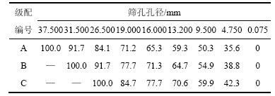 为了分析不同的级配对于土工格室加筋碎石结构层性能的影响,采用连续级配,集料的最大粒径分别为37.500,31.500和26.500 mm,以Taibol公式计算得到3种连续级配,为了提高数值计算的效率,不考虑筛孔为4.75 mm以下的碎石颗粒,因采用的颗粒粒径相对较大,没有足够的细集料填充粗集料形成的骨架,因此,空隙率也取为40%。具体级配组成如表4所示。