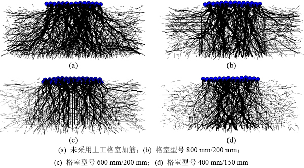 对不同型号的土工格室加筋复合层,在加载过程中的力链分布进行分析,浅灰色线条表示小于平均接触力的弱力链,黑色线条表示大于平均接触力的强力链,线条的粗细与接触力呈正比关系,如图9所示。