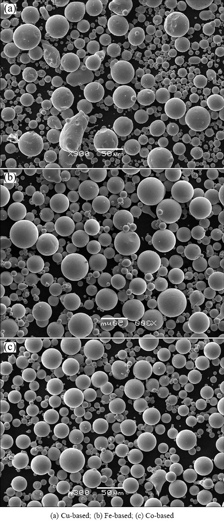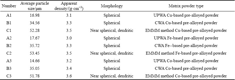 The experimental powders of copper, iron and cobalt based alloy were prepared by UPWA and CWA, and the powder produced by EMMM method was purchased. Technical performance of UPWA powder, water atomization powder and mechanical mixing metal matrix powder used in the experiment is listed in Table 1. The chemical composition of matrix powder material is listed in Table 2. Figure 1 exhibits the particle morphologies of UPWA pre-alloyed powders. Tables 1 and 2 show that the average particle size and the oxygen content of UPWA pre-alloyed powder are far lower than those of the EMMM matrix powder, and also show a certain decrease compared with CWA pre-alloyed powder.