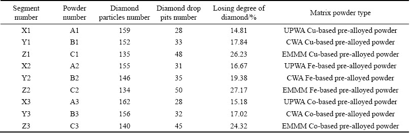 The losing degree of matrix segments prepared by the UPWA powders is lower than the ones prepared by EMMM powders. It is shown that the pre-alloyed powders prepared by UPWA have stronger holding force to diamond than CWA powders. This is consistent with the holding force coefficient results above.