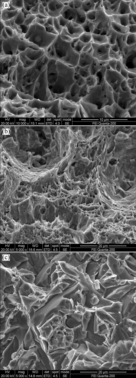 Figure 2 shows the fracture morphology of blank matrix sintered segment using Cu-based pre-alloyed powder prepared by UPWA, CWA and EMMM. It is found that the fracture morphology of the blank matrix sintered segment with pre-alloyed powder prepared by UPWA is dense and dimple, which is the typical characteristic of ductile material (Fig. 2(a)). As shown in Fig. 2(b), the fracture morphology of the blank matrix sintered segment with the CWA pre-alloyed powder is also dimple, but becomes larger compared with one in Fig. 2(a), which means a decrease in toughness of the matrix. In Fig. 2(c), the fracture morphology of the blank matrix sintered segment with the alloy powder prepared by EMMM shows smooth surface, which is the typical characteristic of brittle material. Accordingly, the fracture morphology of the blank matrix sintered segment using the pre-alloyed powder is ductile, while the one using EMMM powder is brittle. Conclusions can be obtained that the pre-alloyed powder has a significantly stronger holding performance to diamonds than the EMMM powder. The UPWA pre-alloyed powder also shows an improved holding ability to diamonds compared with the CWA powder.