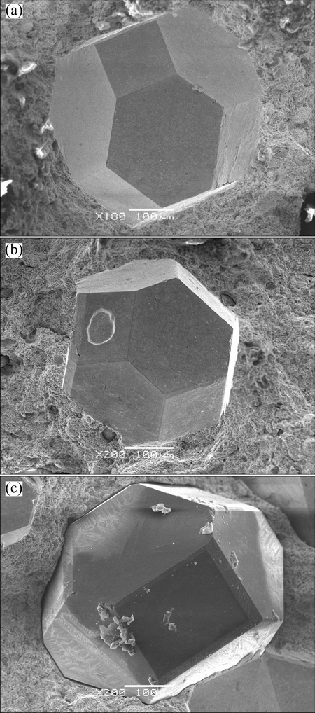 Figure 3 presents the fracture morphologies of the matrix sintered segments with diamonds using the Cu-based pre-alloyed powder prepared by UPWA, CWA and EMMM, respectively. In Fig. 3(a), no obvious gap is observed between diamond and the matrix material, revealing that the elements with strong carbide forming ability in the matrix material react with diamond in response. As a result, the bonding force is not only mechanical but also chemical. Thus, the holding ability of matrix material to diamonds is notably enhanced. The same phenomenon is also observed in Fig. 3(b). As can be seen in Fig. 3(c), the gap between diamond and matrix material is wide and continuous. The pit surface is dense and smooth. This phenomenon indicates that the bonding between the matrix and diamond is not chemical but mechanical. This indicates that the holding ability between the matrix material and diamonds is greatly increased by using the UPWA powder when compared with the EMMM powder.