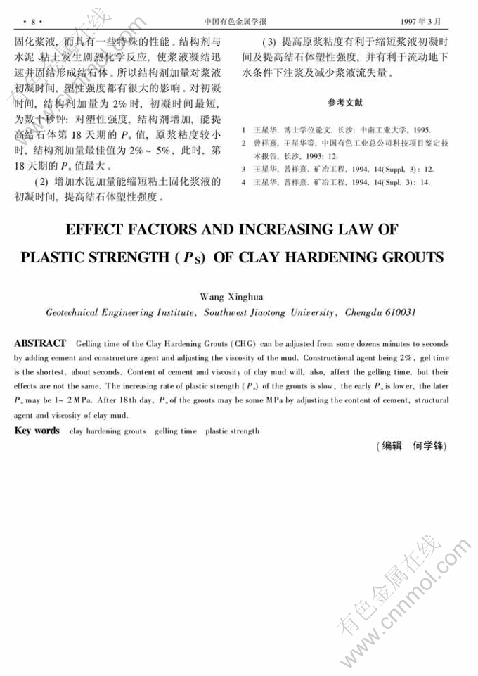 Key words:clay hardening grouts gelling time plastic strength