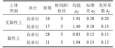 ZHANG等[5]提出群桩效应系数ζ服从对数正态分布,并给出了群桩效应系数的均值μζ、标准差σζ和变异系数δζ等统计参数,见表1 (为尽量减少样本间的差异性,在本研究中,选取的群桩样本的桩间距都为3倍桩径)。