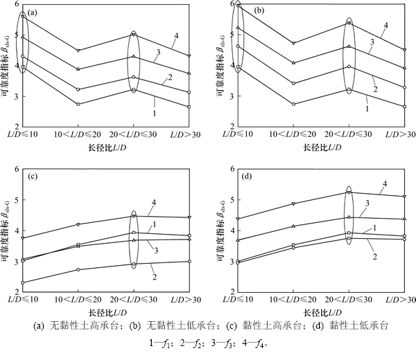 由图1(c)和图1(d)还可以看出:不考虑群桩效应和系统效应(f1)、考虑群桩效应而不考虑系统效应(f2)、考虑群桩效应和较弱的系统效应(f3)和考虑群桩效应和较强的系统效应(f4)4类情况所对应的可靠度指标随L/D变化曲线排列次序的变化情况,与由图1(a)和图1(b)得出的结果也具有明显的差异,这是由群桩效应的强度不同造成的。譬如,无黏性土高承台、无黏性土低承台、黏性土高承台和黏性土低承台4种条件下的群桩效应系数分别为1.41,1.40,0.83和1.04。具有大于1的群桩效应系数的群桩,其群桩效应提高了群桩的可靠性;而具有小于1的群桩效应系数的群桩,其群桩效应降低了群桩的可靠性。