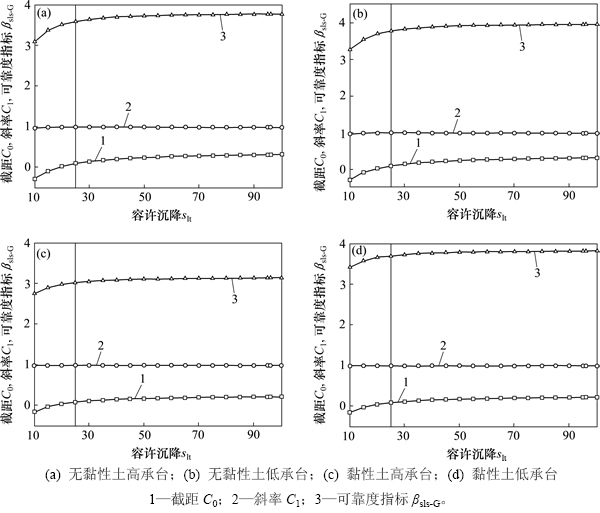 与可靠度指标随slt的变化规律相比较,由图2还可知,对于不同土体性质和承台类型的4种条件,无论线性关系系数C0还是C1,随slt变化的情况都具有高度的一致性。C0随slt的增大而增大,但增大幅度逐渐降低,且也在slt大于25 mm以后,不再有较大的改变;但C1始终保持在1附近,表明slt对其影响较小。另外,基于式(7),C0和C1随slt的变化规律也解释了群桩可靠度指标βsls-G随slt逐渐增大但增大幅度逐渐减小的结论。