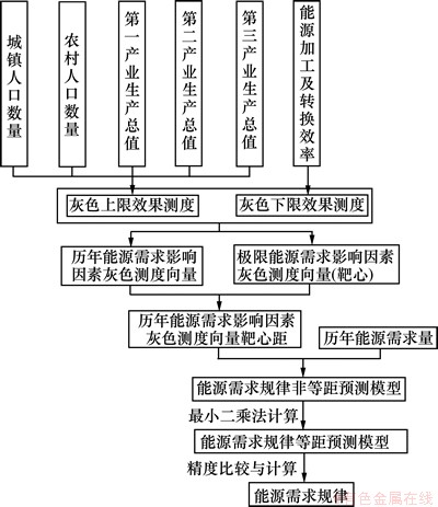 能源是人类生存、社会进步与经济发展不可或缺的基础性物质,它对社会发展与人民生活水平提高起重要作用。然而,由于经济快速发展,人口增加,对能源的需求量越来越大,能源的供需矛盾日益突出:因此,对能源需求内在规律进行分析,对能源需求量的预测以及能源进行合理配置都具有重要的现实意义。对能源需求预测常见的模型有灰色预测模型[1]、神经网络预测模型[2]、群智能优化预测模型[3]以及趋势外推[4]等模型。由于能源需求系统的复杂性,影响能源需求量的因素很多,各影响因素之间在量纲、物理意义及对能源需求的影响都不一致,且目前还没有成熟的、完全量化的理论计算公式。针对以上问题,本文作者利用改进灰靶决策理论[5-7]与非等距预测模型[8-9]相结合的方法(GTDM-NE)来预测我国能源需求规律。利用改进灰靶决策将各影响因素指标趋势一致与去量纲化,并由此计算历年来各影响因素指标与理论靶心的靶心距,构建符合数据特征规律的非等距预测模型,得到各影响因素与能源需求量之间的规律。改进后的灰靶决策理论通过灰色测度计算生成效果向量,完全摆脱了人为主观因素的干扰,使计算过程更加科学;而非等距预测模型则突破了以往趋势化判定以及智能预测等模型以等距年份为单一自变量的不足。