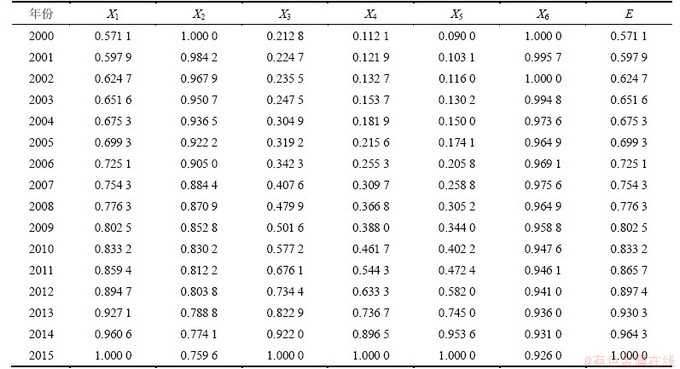 影响能源需求的因素很多,但各个因素的影响程度不尽相同,有些因此指标越大,所反映的能源需求量也就越大,这些指标有X1,X2,X3,X4和X5;而X6越大,所反映的能源需求量反而越小。为将各影响因素指标对能源需求量的影响趋势归一化,采用灰色效果测度进行测算,对于指标X1,X2,X3,X4和X5采用灰色上限效果测度进行处理: