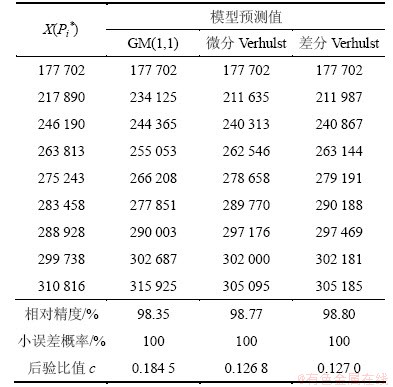 有负值,将负值去掉后得到用来进行灰色预测的原始数据序列为:X(Pi*)= (177 702, 217 890, 246 190, 263 813, 275 243, 283 458, 288 928, 299 738, 310 816)。根据X(Pi*),建立GM(1,1)模型、微分Verhulst模型以及差分Verhulst模型。得到其GM(1,1)模型的参数列