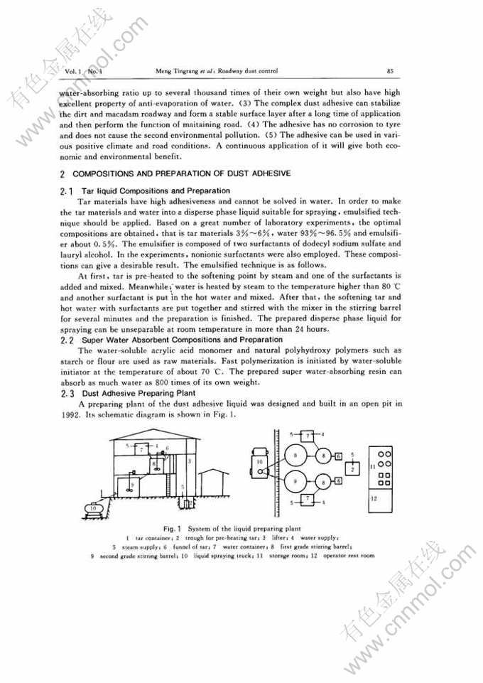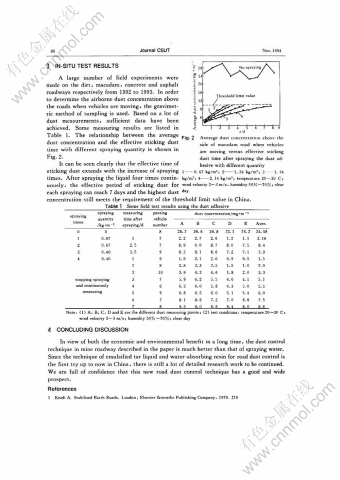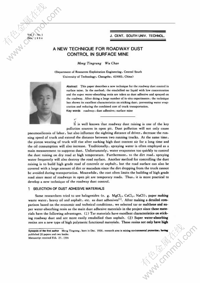 Abstract: This paper describes a new technique for the roadway dust control in surface mine. In the method, the emulsified tar liquid with low concentration and the super water-absorbing resin are taken as dust adhesive and sprayed on the roadway. After doing a large number of in-situ experiments, the technique has shown its excellent characteristics on sticking dust, preventing water evaporation and reducing the combined cost of truck transportation.