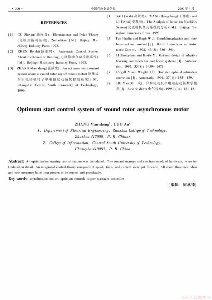 Key words:asynchronous motor; optimum control; copper wastage; controller