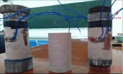 将2个长×宽为3 mm×20 mm的电阻应变片对称粘贴在试样轴向中心部位以测试试样轴向变形,2个长×宽为3 mm×5 mm横向对称粘贴在试样中心位置测试其横向变形,电阻应变片电阻均为120 Ω。粘贴电阻应变片后的岩石试样如图2所示。应用DH3821静态应力应变测试分析系统采集应变。