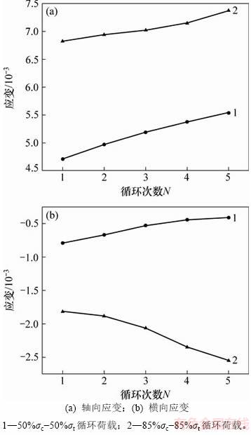 3) 在2种不同恒定压-拉荷载作用下,试样均出现一定程度的残余永久变形;在85%σc-85%σt循环荷载作用下,试样轴向与横向残余永久应变均随着循环次数增加而增加;在50%σc-50%σt循环荷载作用下,试样轴向应变随着循环次数增加而增加,而横向应变却随着循环次数增加呈线性减小趋势。