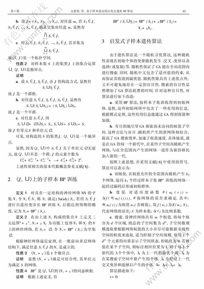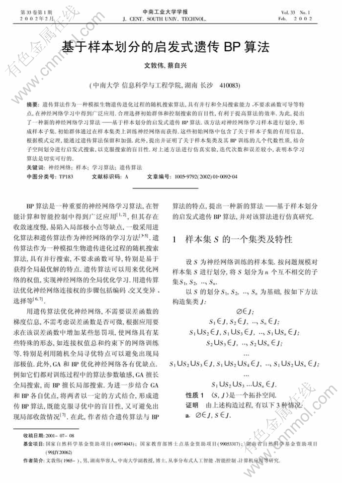 摘 要:遗传算法作为一种模拟生物遗传进化过程的随机搜索算法,具有并行和全局搜索能力、不要求函数可导等特点,在神经网络学习中得到广泛应用.合理选择初始群体和控制搜索的盲目性,有利于提高算法的效率.为此,提出了一种新的神经网络学习算法———基于样本划分的启发式遗传BP算法.该方法对神经网络学习样本进行划分,形成样本子集.初始群体通过在样本集类上训练神经网络而获得.这些初始网络中包含了关于样本子集的有用信息,根据模式定理,能通过遗传算法保留和加强.此外,提出并证明了关于样本集类及其BP训练的几个代数性质,结合子空间划分进行启发式搜索,以克服搜索的盲目性.对上述方法进行仿真实验,迭代次数和误差较小,表明本学习算法是切实可行的.