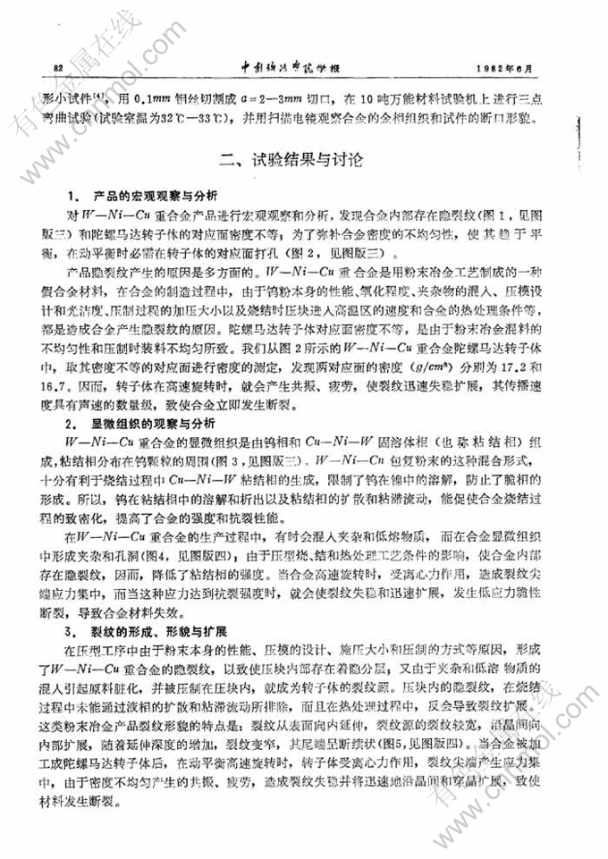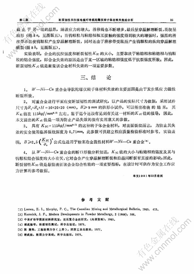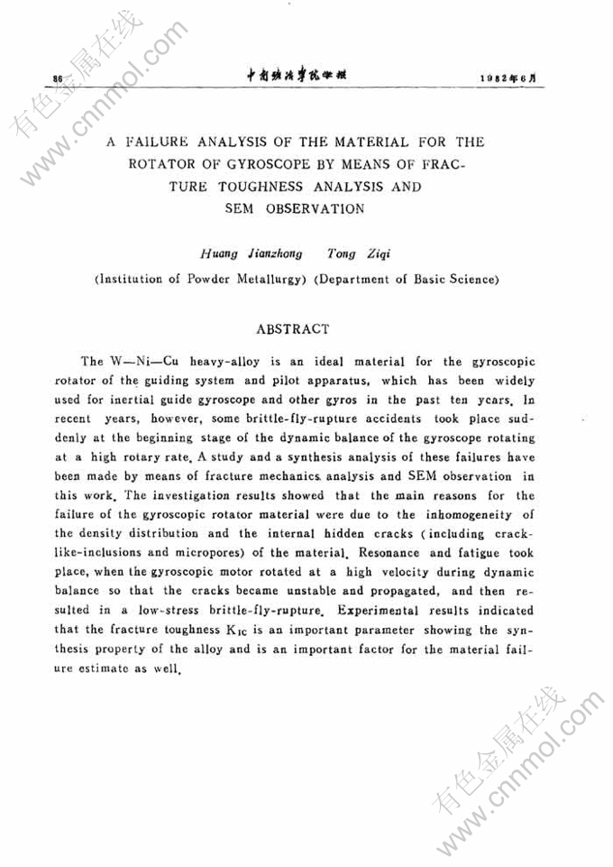 Abstract: The W--Ni--Cu heavy-alloy is an ideal material for the gyroscopicrotator of the guiding system and pilot apparatus, which has been widelyused for inertial guide gyroscope and other gyros in the past ten ycars. Inrecent years, however, some brittle-fly-rupture accidents took place sud-denly at the beginning stage of the dynamic balance of the gyroscope rotatingat a high rotary rate. A study and a synthesis analysis of these failures havebeen made by means of fracture mechanics, analysis and SEM observation inthis work. The investigation results showed that the main reasons for thefailure of the gyroscopic rotator material were due to the inhomogeneity ofthe density distribution and the internal hidden cracks (including crack-like-inclusions and micropores) of the material. Resonance and fatigue tookplace, when the gyroscopic motor rotated at a high velocity during dynamicbalance so that the cracks became unstable and propagated, and then re-sulted in a low-stress brittle-fly-rupture. Experimental results indicatedthat the fracture toughness KIC is an important parameter showing the syn-thesis property of the alloy and is an important factor for the material fail-ure estimate as well.