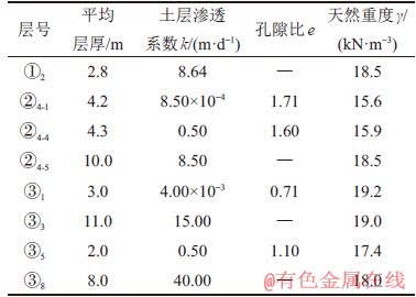 福州地铁2号线某车站基坑工程总长约200 m,标准段宽19.7 m,标准段基坑开挖深度约16 m。车站基坑采用明挖顺筑法施工,主体围护结构采用厚度80 cm的地下连续墙。场地从上而下地层主要为杂填土①2、淤泥②4-1、淤泥夹砂②4-4、淤泥质中细砂②4-5、粉质黏土③1、中粗砂③3、卵石③8。场地地质平面示意图如图2所示。根据场地地质勘探资料,松散岩土类孔隙承压水主要赋存于淤泥质中细砂②4-5、中粗砂③3和卵石③8中,相对隔水层(淤泥②4-1、淤泥夹砂②4-4、粉质黏土③1)分布不连续,且基坑中部位置存在“天窗”,各含水层间水力联系非常密切,基坑地下水控制极其困难。土体物理力学性质如表1所示。