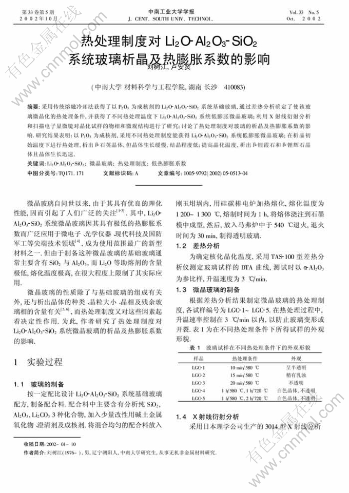 关键词:Li2O-Al2O3-SiO2;微晶玻璃;热处理制度;低热膨胀系数