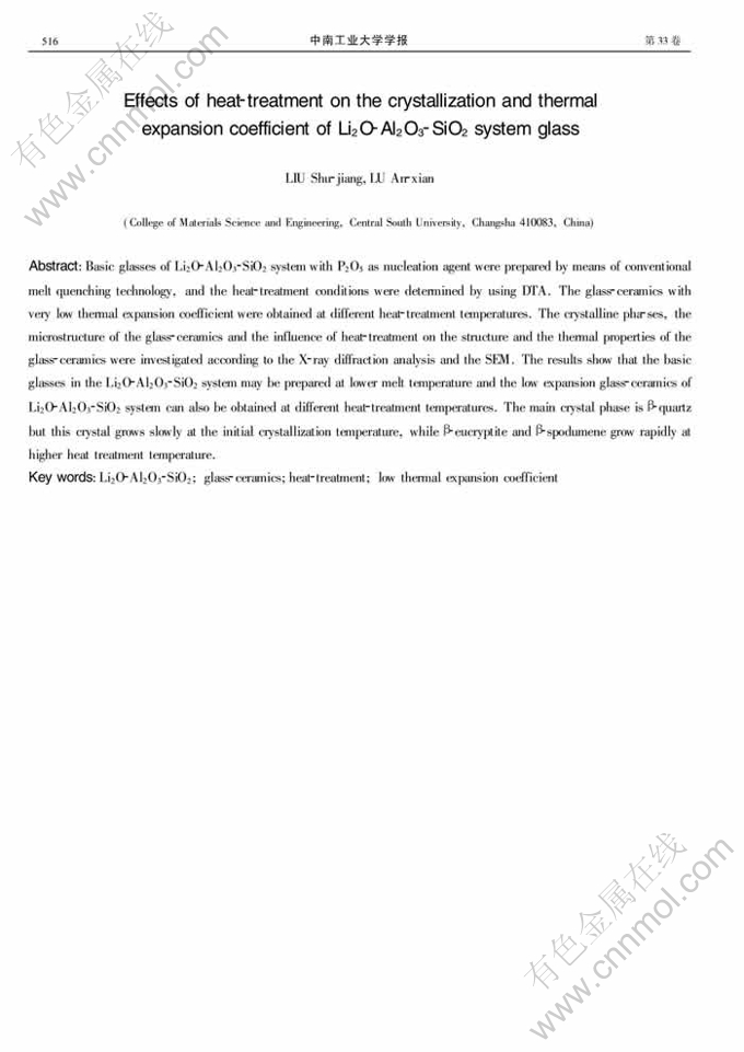 Key words:Li2O-Al2O3-SiO2;glass-ceramics;heat-treatment;low thermal expansion coefficient