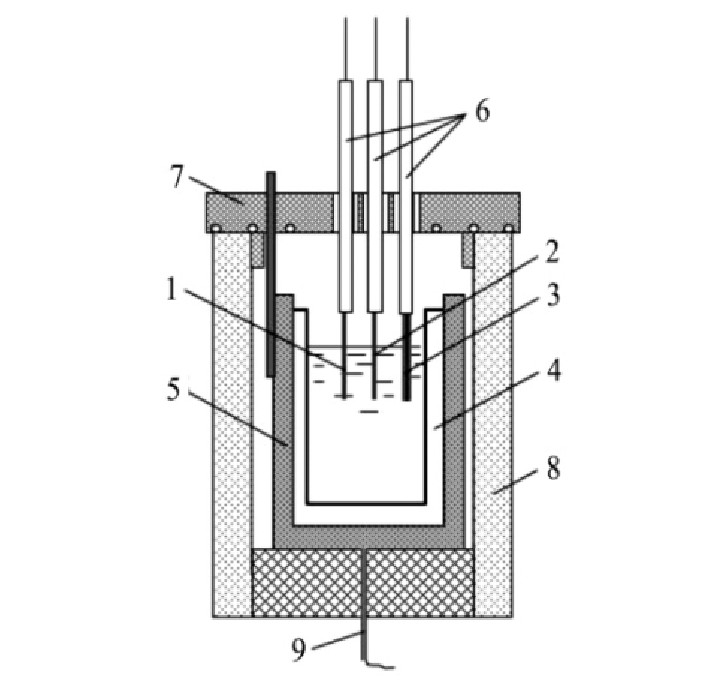 1-Working electrode;2-Reference electrode;3-Auxiliaryelectrode;4-Corundum crucible;5-Iron crucible;6-Corun‐dum pipe;7-Insulation cover;8-Resistance furnace;9-Heatelectric couple