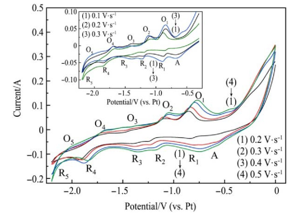 。表明:还原峰R1 处发生的反应为:Ti4+ +e- →Ti3+ ;还原峰R2 处发生的反应为:Ti3+ +e- →Ti2+ ;还原峰R3 处发生的反应为:Ti2+ +e- →Ti+ ;还原峰R4 处发生的反应为:Ti+ +e- →Ti,进一步验证了线性扫描伏安与循环伏安测试结果的正确性。
