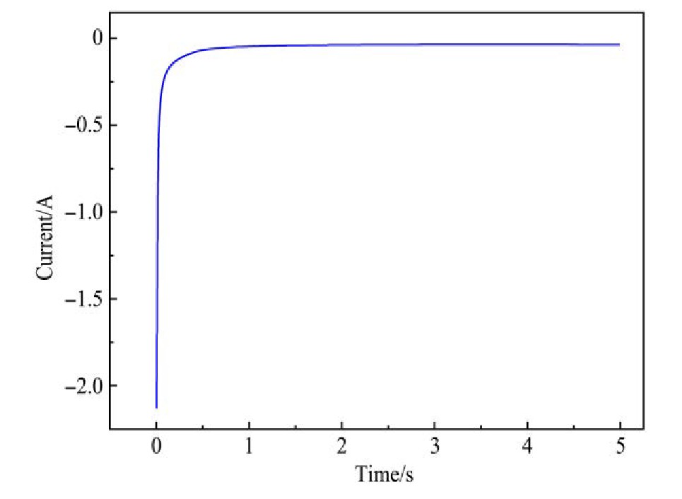 图9为给工作电极施加一个-1.85 V恒电位条件下测试的1073 K时42.62%Na Cl-54.38%KCl-3%K2 Ti F6 熔盐中Ti4+ 在钨电极上的计时电流曲线,当给工作电极施加-1.85 V恒电位时,在电极附近形成环形电场,熔盐中阴阳离子在电场力的作用下定向迁移,其中Ti4+ ,K+ ,Na+ 阳离子向工作电极迁移,引起工作电极与参比电极间阴阳离子浓度减小,随着Ti4+ 在工作电极表面得电子析出导致工作电极附近Ti4+ 浓度减小,熔盐电解质内阻增大,导致电流减小,对应计时电流测试曲线中一开始电流值从一个极大值迅速减小阶段。工作电极附近与熔盐本体中存在Ti4+ 浓度差,在浓度梯度以及电场力作用下,熔盐中Ti4+ 向工作电极表面扩散,由于电子在导体中的移动速率大于熔盐中离子的扩散速率,导致电极表面反应受熔盐中Ti4+ 向工作电极表面扩散控制。在一段时间后扩散速率与电极表面得电子析出速率会近似维持一个动态平衡,即对应计时电流测试曲线上电流信号的稳定阶段。