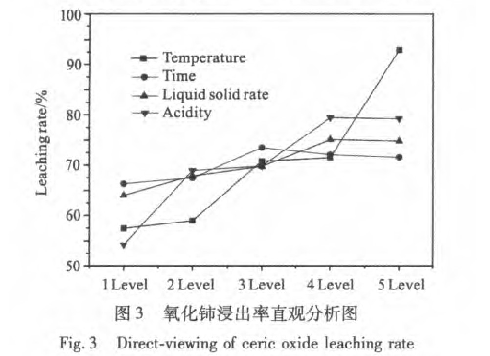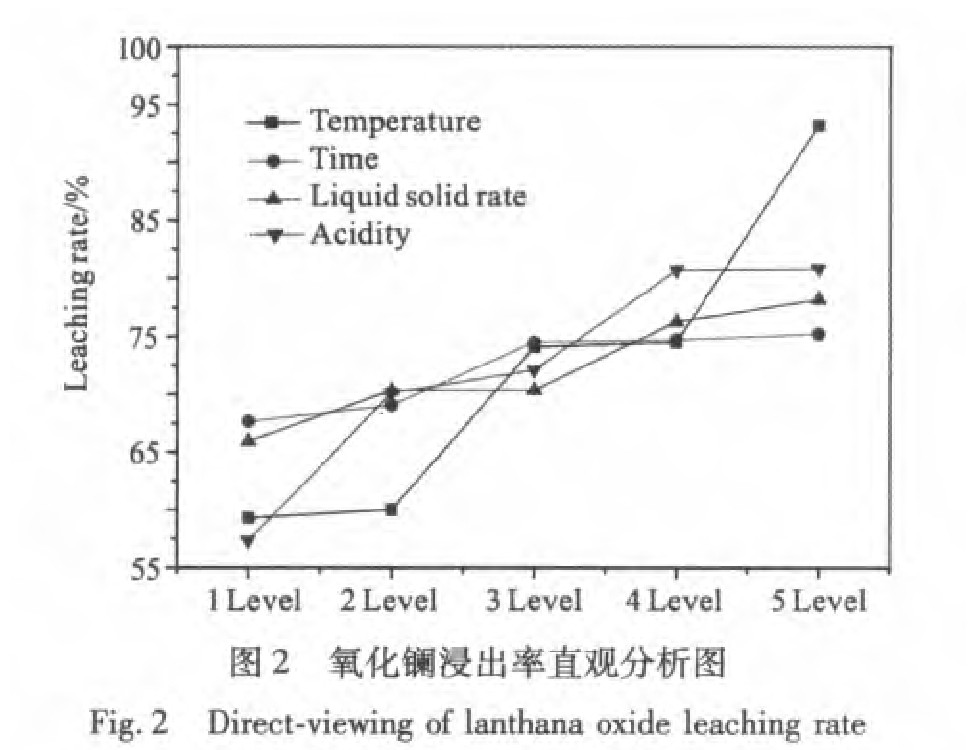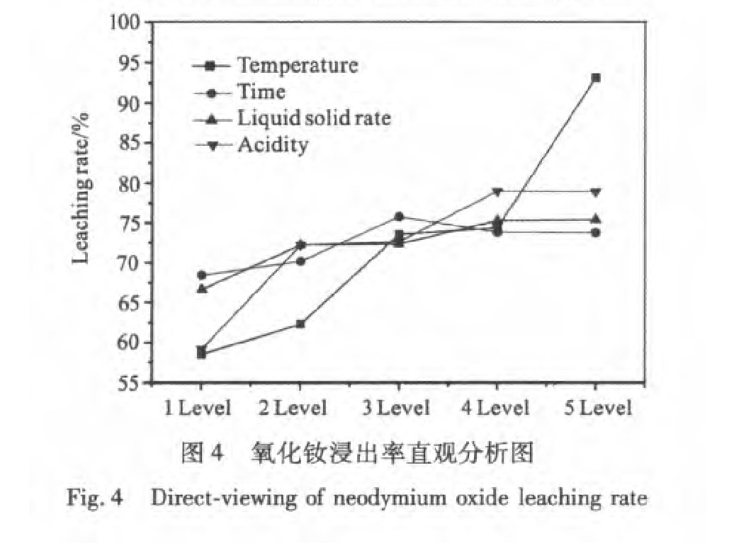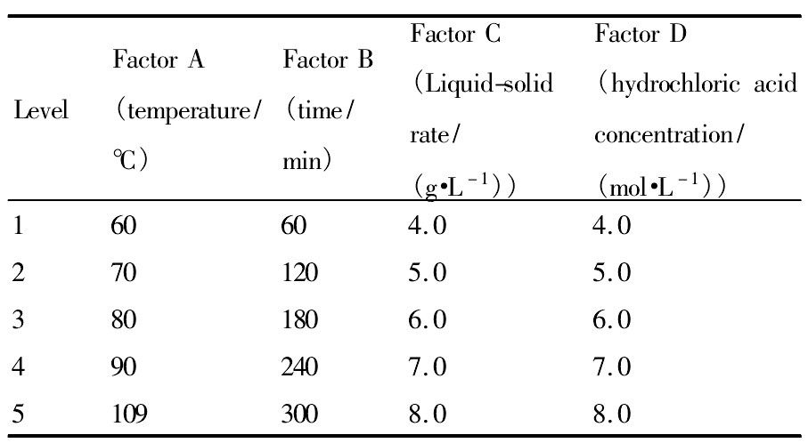 将烘干后的氧化铝赤泥放入圆底三口烧瓶中,加回流装置,电动搅拌,加入盐酸搅拌浸出[8]。浸出液固比;浸出时间;浸出温度;盐酸浓度[9]采用正交设计,试验采用4因素5水平正交设计[10],见表3。本文主要考察氧化镧、氧化铈、氧化钕的浸出效果。