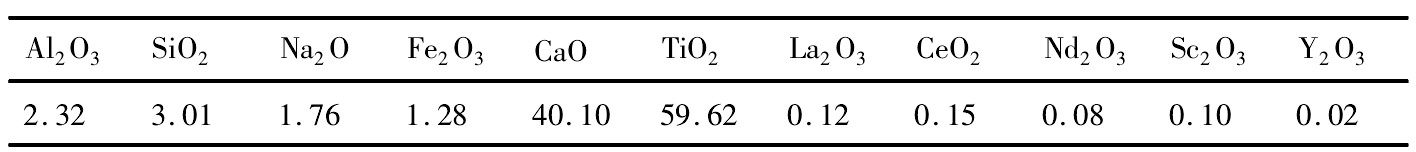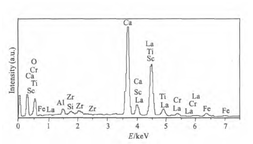 由于赤泥中的稀土元素呈分散态赋存在赤泥中[11],在高p H值,即强碱状态下,使稀土离子定量地转变成稀土氢氧化物,脱水后便生成稀土氧化物凝胶,干燥后,变成氧化物分散在赤泥中[12],国内的专家对赤泥中的Sc和RE的物相做了大量的研究表明[13],赤泥中的Sc和RE不是离子吸附型,也不存在于新形成的铝硅酸盐矿物相中,主要以类质同象形式分散于铝土矿及其副矿物,如金红石、钙钛矿、各新生矿物中[14],钙钛矿中稀土含量较高[15,16],赤泥中钙钛矿的X射线能谱分析结果见表4,钙钛矿的能谱图见图1。