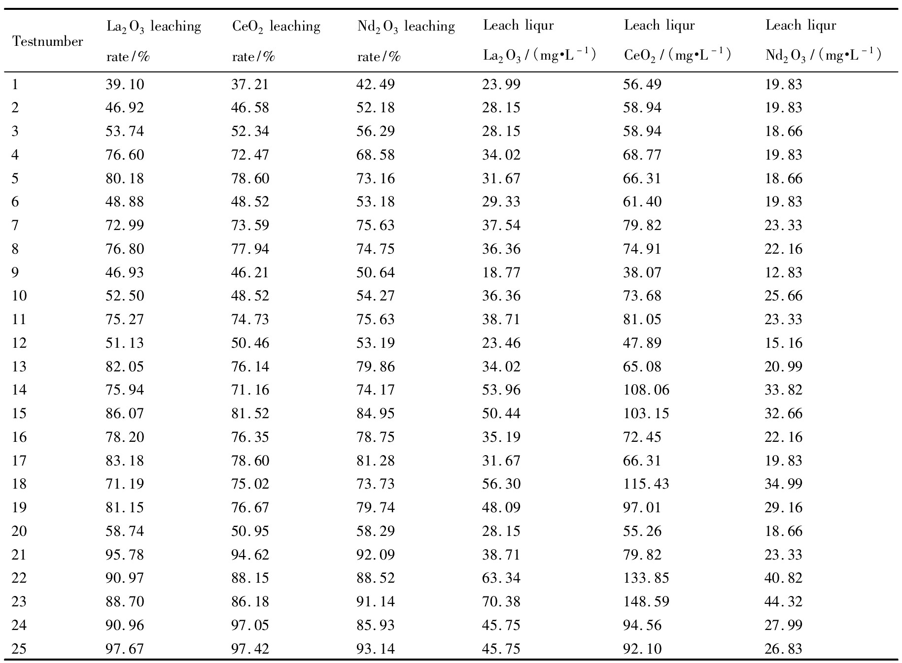 试验结果见表5,考察浸出液中氧化镧、氧化铈、氧化钕浓度及浸出率。